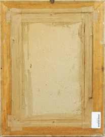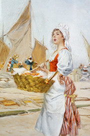 Donna con cesta, olio su tela riportata su cartone, cm 33x22, firmato, entro cornice.