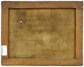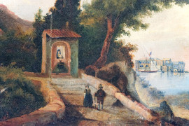 Edicola sacra in riva con figure, olio su tela, cm 37x46,5, inizi XX secolo, (difetti sulla tela).