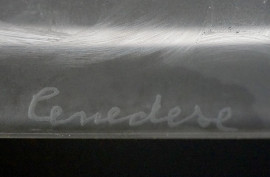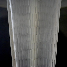 Gino Cenedese (1907-1973), Lampada da tavolo in vetro satinato, Murano, fusto ad obelisco rovesciato con decori incisi alla mola, poggiante su base circolare; paralume recante la firma del mastro vetraio, cm h 57 circa