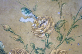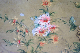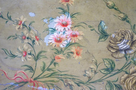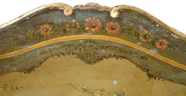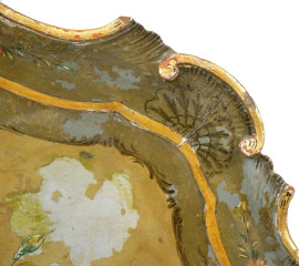 Grande vassoio di linea sagomata in legno laccato e dipinto, cm h 53x70, inizi XX secolo, (difetti).