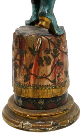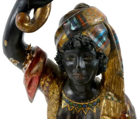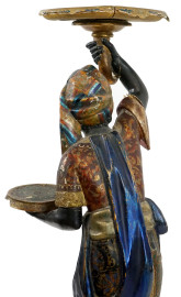 Gueridon in legno scolpito e laccato, XIX secolo, fusto a figura di mora con turbante, veste drappeggiata e dipinta in policromia, cm h 115, (difetti)