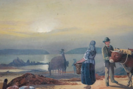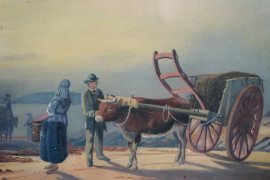 Lago Maggiore con calesse e figure, acquarello su carta, cm 22x50, fine XIX- inizi XX secolo, entro cornice.