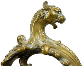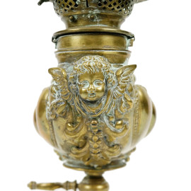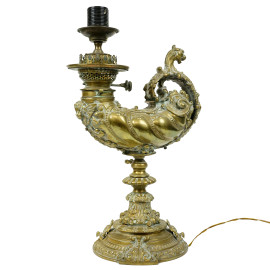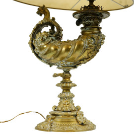 Lampada a navicella in bronzo dorato, corpo baccellato con presa zoomorfa, fusto tornito e cesellato poggiante su base circolare, cm h 45