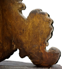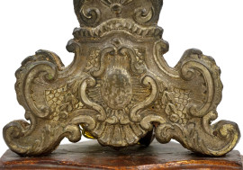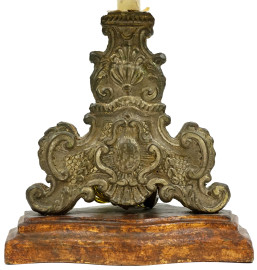 Lampada da tavolo in legno intagliato e dorato, rivestita in lamina di metallo sbalzata, poggiante su base sagomata, cm h 26x25x13, XIX secolo, (elementi sostituiti, difetti).
