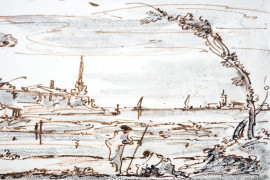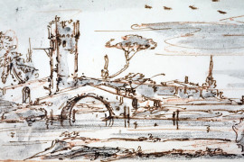Paesaggio fluviale con ponte e astanti, penna e acquarello su carta, cm 9,3x18,3