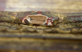 Leggìo da tavolo in legno intagliato e dorato, fine XIX-inizi XX secolo, cm h 8x40x35, (difetti).