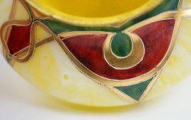 Lotto composto da due vasetti in vetro smaltato policromo ed inclusioni a foglia d'oro, alt.max cm 12.5, XX secolo, (segni del tempo).