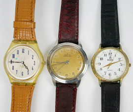 Lotto di tre orologi da polso, marche diverse, cinturini in pelle, lunghezza max cm 22,5, (difetti, meccanismi da revisionare).