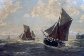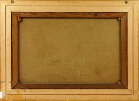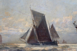 Marina con imbarcazioni, olio su tela, cm 65x101, firmato, entro cornice