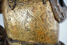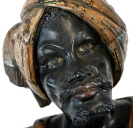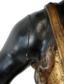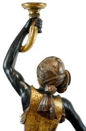 Moro reggitorcia in legno scolpito, ebanizzato e dorato, XIX secolo, cm h 178, (difetti)