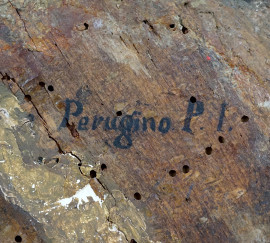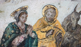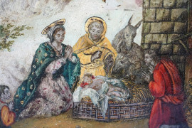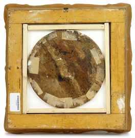Natività, antico dipinto ad olio su tavola, cm 24,5x24, entro cornice, (difetti).