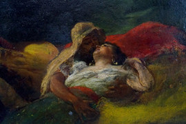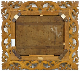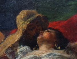 Nell'alcova del sultano, olio su tavola, cm 30X36, firmato S. Ussi, entro antica cornice in legno intagliato e dorato