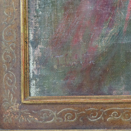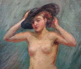 Nudo di donna con cappello, olio su tela, cm 33,5x23, firmato, entro cornice, (lieve caduta di colore).