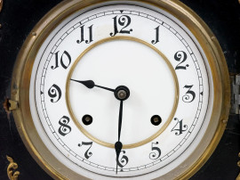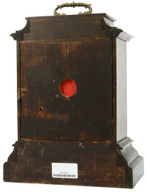 Orologio da tavolo, Germania, inizi XX secolo, cassa in legno ebanizzato, quadrante circolare a numeri arabi, applicazioni in metallo dorato, cm h 36x29x16,5, (difetti, meccanismo da revisionare)