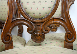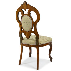 Otto sedie Carlo X in noce, XIX secolo, sedute e schienali imbottiti e rivestiti in stoffa, gambe anteriori mosse, le posteriori a sciabola, cm h 102, (difetti).
