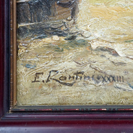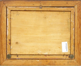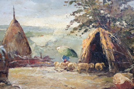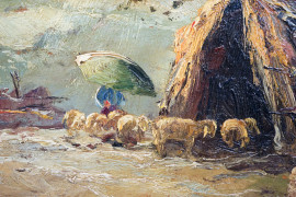 Paesaggio con pastore e gregge, olio su legno, cm 24x33, firmato, entro cornice.