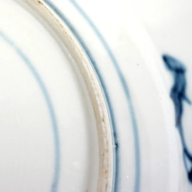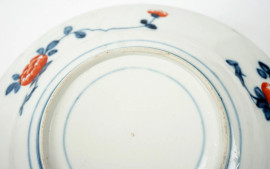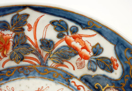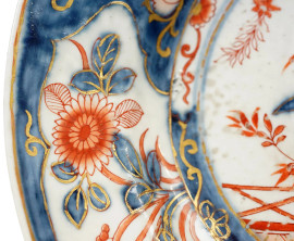 Piatto in porcellana policroma, arte orientale, XX secolo, decori a motivi vegetali e floreali, diam. cm 21,5, (sbeccature).