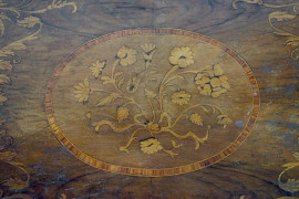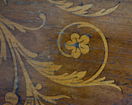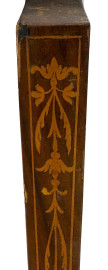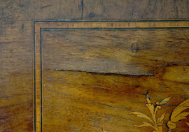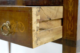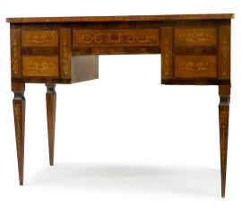 Piccolo scrittoio in legno impiallacciato ed intarsiato, XX secolo, fronte a cinque cassetti, gambe troncopiramidali, cm h 77,5x101x49,5, (difetti)