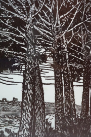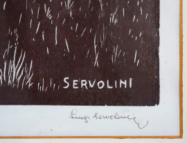 Pini, xilografia, cm 42,5x32, firmata Luigi Servolini, entro cornice.