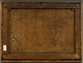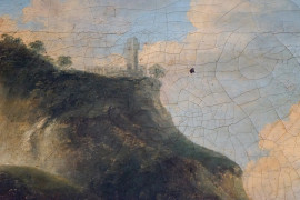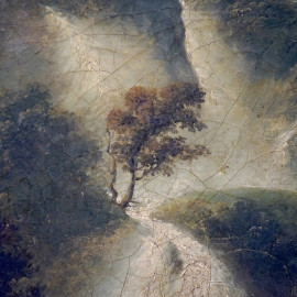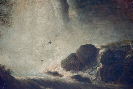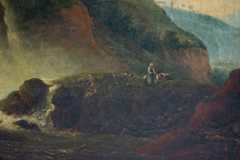 Pittore del XIX secolo, Paesaggio con cascata e figure, olio su tela, cm 62x86, entro cornice, (cadute di colore).
