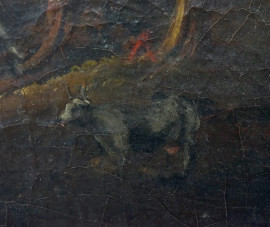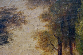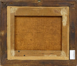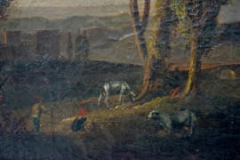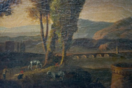 Pittore del XVIII secolo, Paesaggio con ponte e figure, olio su tela, cm 33x38,5, entro cornice.