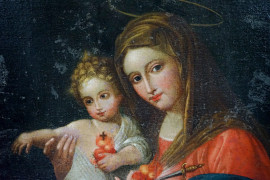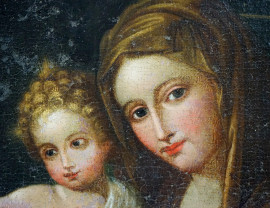 Pittore del XVIII-XIX secolo, Madonna col Bambino e Sacro Cuore, olio su tela, cm 75x62, entro cornice, (restauri)