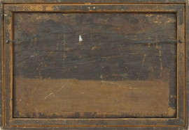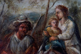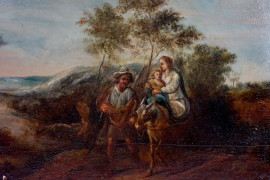 Pittore fiammingo del XVII secolo, Fuga in Egitto, olio su tavola, cm 22x34,5, entro cornice, (difetti).