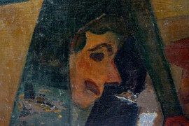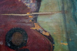 Pittore post-cubista, Tavola imbandita con maschera e chitarra, olio su tela, cm 75x95,5, (difetti sulla tela).