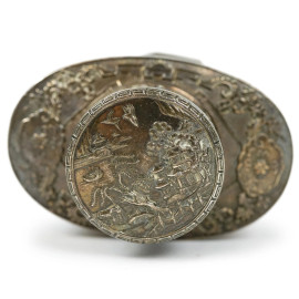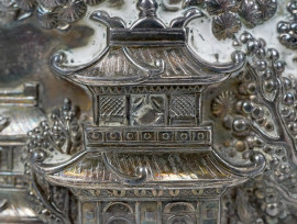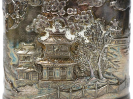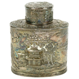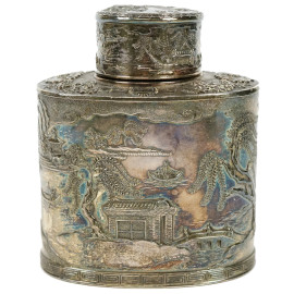 Porta thè in metallo argentato, Cina, XX secolo, decori raffiguranti paesaggi, cm h 12x9,8x6,1, (lievi difetti)