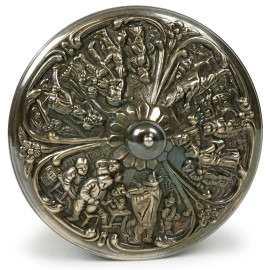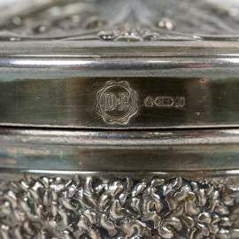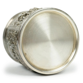 Porta thè in metallo argentato, XX secolo, decorato con scene di genere, cm h 11x8