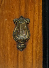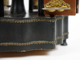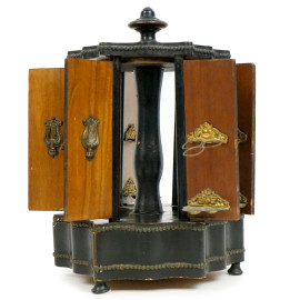 Portasigari Napoleone III in legno ebanizzato, con sei piccoli sportellini, base sagomata, applicazioni in metallo dorato, cm h 28, (difetti).