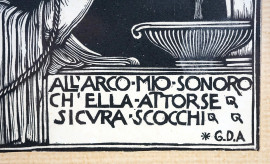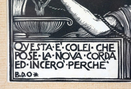 Questa è colei che pose la nova corda […], xilografia, cm 10x20, inizi XX secolo, entro cornice.