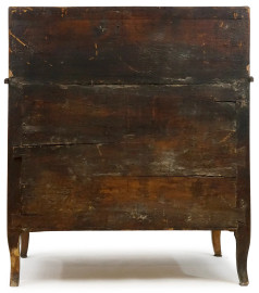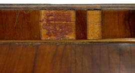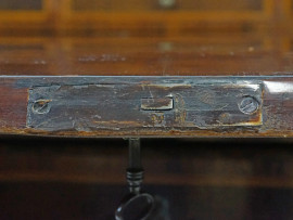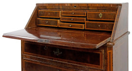 Ribalta impiallacciata ed intarsiata in varie essenze, fine XVIII secolo, fronte a tre cassetti e calatoia celante cassettini e vano a giorno, gambe mosse, cm 108x94x53, (difetti)
