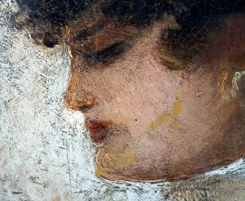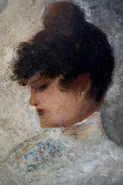 Ritratto di donna, olio su cartone, cm 21x15, firmato, entro cornice.