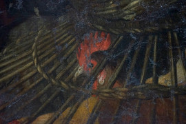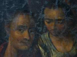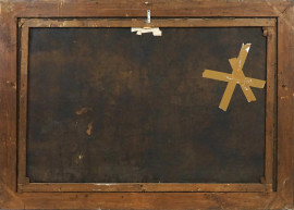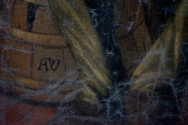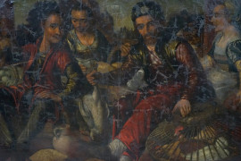 Scena di mercato, olio su tela, cm 106,5x157, siglato AW in basso a sinistra sulla botte, entro cornice, (difetti e restauri)