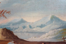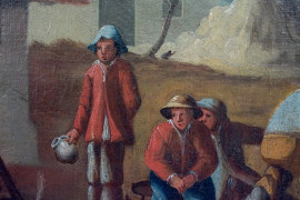 Scuola del nord-italiana del XVIII secolo, Paesaggio con giocatori di birilli, olio su tela, cm 45,5x63