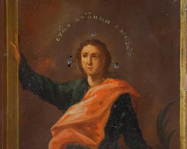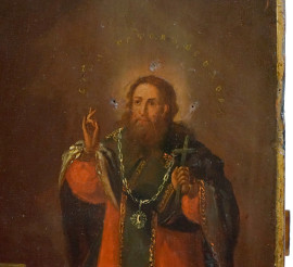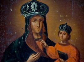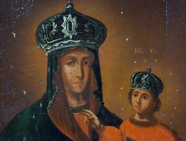 Scuola Ucraina (ex Dubovyci, attuale regione di Sumy), XIX secolo, Immagine del miracolo dell'icona di una semplice Madre Dubovytska (con Alessandro martire in basso a destra e S. Vladimiro Basilio in alto a destra), olio su tavola, cm 53,2x44,3, datata in basso a destra "7 Aprile 1832)