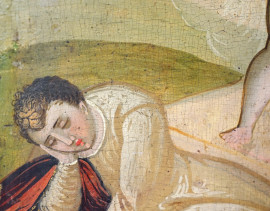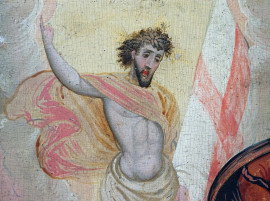 Scuola veneto-cretese del XVI-XVII secolo, Resurrezione, olio su tavola, cm 28x24,5, (difetti).