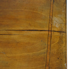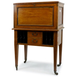 Secrétaire in legno impiallacciato e filettato, fine XIX secolo, fronte con piano a ribalta, due cassettini e portalettere sottostanti, quattro gambe troncopiramidali complete di rotelle, cm 121x82,5x46,5, (difetti)