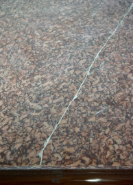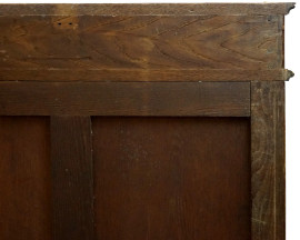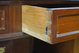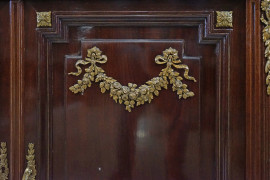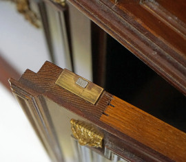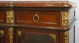 Servante francese in legno lastronato in mogano, inizi XX secolo, piano in marmo, fronte a quattro cassetti e quatto ante di cui due a vetri, finiture e prese in bronzo dorato, cm 104x184x62