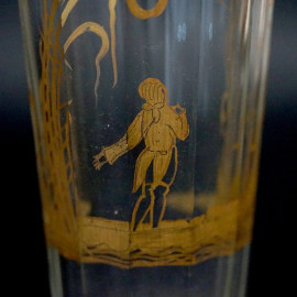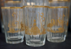 Servizio di bicchieri in vetro, con decori dorati raffiguranti paesaggi e scene galanti, alt. max cm 23, XX secolo, (difetti).