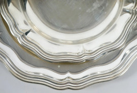 Servizio di piatti in argento, inizi XX secolo, composto da 12 piattini, 12 piattini da pane, 2 vassoi di linea circolare, 3 vassoi di linea ovale, peso totale gr. 6916