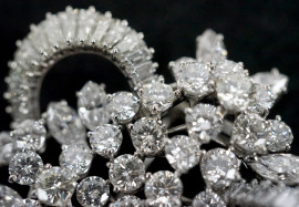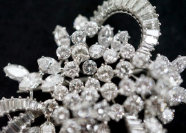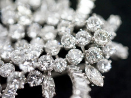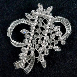 Spilla in oro bianco, con 40 brillantini taglio brillante (tot.4 carati circa), 13 brillanti taglio marquise (tot. 3 carati circa), 54 brillanti taglio baguette. Misure cm 5,5X5. Peso gr.27,4.