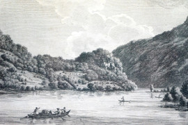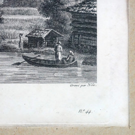 Stampa raffigurante "Vue preise du Pont de Peage pres d'interlaches", disegnatore Jean-Jacques-François Le Barbier, incisore Née, XIX secolo, entro cornice.
