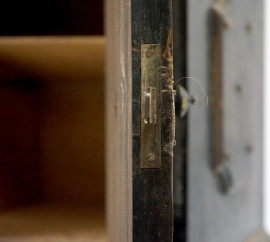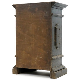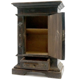 Stipo in noce, inizi XX secolo, fronte ad uno sportello e cassettino sottostante, piedi a mensola, borchie applicate, cm h 52,5x37x22, (difetti, mancante chiave)