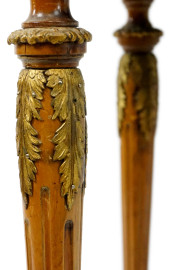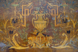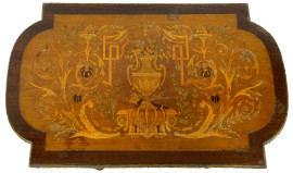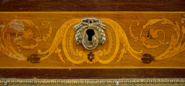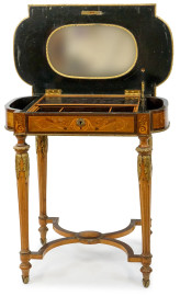 Tavolo da lavoro, XIX secolo, in legno intarsiato in varie essenze, piano apribile con specchio e scomparti all'interno, gambe rastremate e scanalate riunite da crociata, applicazioni in bronzo dorato, cm h 74,5x70x42, (difetti)