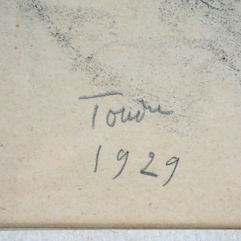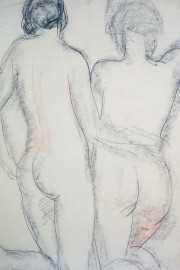 L'abbraccio, matita e carboncino su carta applicata su cartone, cm 49,5x42, datato 1929, entro cornice.