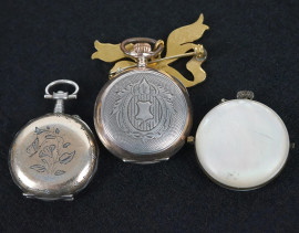 Tre monachine in argento, fine XIX-inizi XX secolo, quadranti circolari a numeri arabi e romani, misure max cm 4,5x3, (difetti, meccanismi da revisionare)