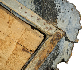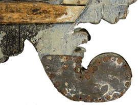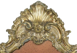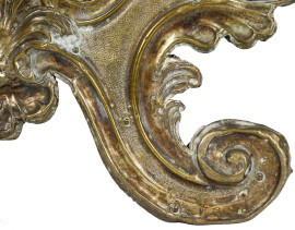 Trittico di cartagloria del XVIII secolo in lamina di metallo argentato e sbalzato, decori a conchiglie, volute e foglie d'acanto, piedini a ricciolo, ingombro max cm 41x40, (difetti).