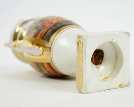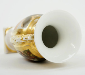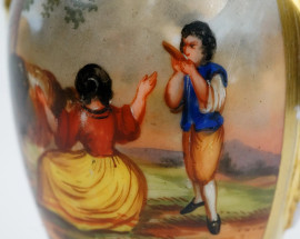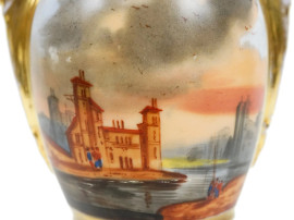 Vasetto in porcellana Impero, XIX secolo, corpo con decoro policromo raffigurante paesaggio e contadini, anse a cigni, lumeggiature dorate, cm h 22